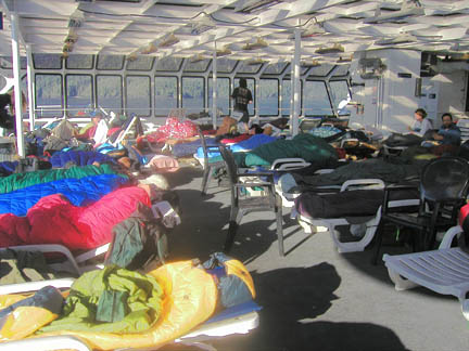 There aren't enough cabins on the ferry, but it's fine to camp out on the deck.