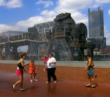 Dancing FountainThree Rivers Heritage Trail section of Great Allegheny Passage The dancing fountain in Station Square, just across from downtown. This fountain is choreographed to music; we call it the “dancing fountain”. Here, people are dancing in the spray. This is part of Pittsburgh’s very successful redevelopment of the riverfronts as public recreational space.