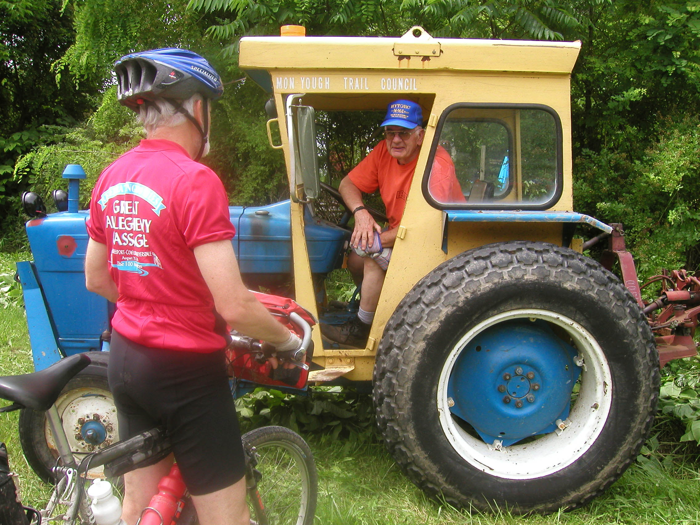 VolunteersThe tractor driver is the head of a group of mostly-retired volunteers who do most of the maintenance and much of the construction on the Youghiogheny River Trail North. The biker is a leader of trail development on the Montour and Panhandle trails. |