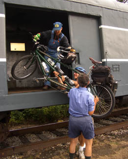 Riding Rails and TrailsThe Cuyahoga Valley Scenic RR has several stops near the trail and in several places runs right alongside the trial. The train runs a boxcar to carry bikes, and last summer we used the train as shuttle for a ride from Akron to the outskirts of Cleveland. We boarded at Rockside Rd, and here we’re unloading bikes at the Akron station. |