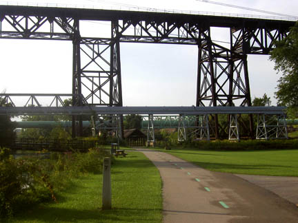 CSX "Short Line" TrestleThe high structure is the historic trestle built by the New York Central RR in 1907 to bypass congestion in Cleveland. It’s 160 ft high, 1988 ft long and still carries 40-50 trains a day. Beneath it are a variety of pipelines. The trail passes under all of this in a structure much like a covered bridge, presumably to protect trail users from stuff falling from the trains. |