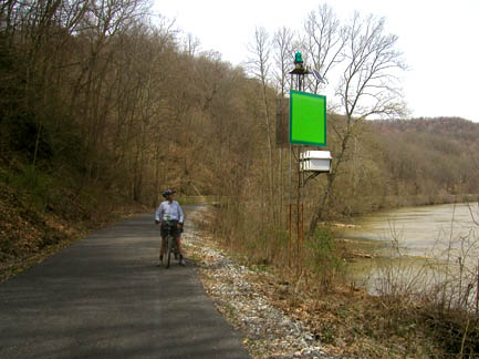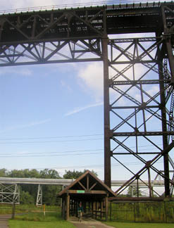 Trail Under CoverCuyahoga Valley Trail, near Cleveland, OH The high structure is the historic trestle built by the New York Central RR in 1907 to bypass congestion in Cleveland. It’s 160 ft high, 1988 ft long and still carries 40-50 trains a day. Beneath it are a variety of pipelines. The trail passes under all of this – to protect trail users from stuff falling from the trains, the trail developer installed a protective structure much like a covered bridge. |