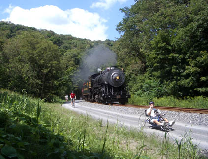 Steam Shares the TrailAllegheny Highlands section of the Great Allegheny Passage NRT, east of Frostburg, MD From Cumberland to Frostburg the Great Allegheny Passage shares the railway alignment with the Western Maryland Scenic Railroad, which runs several excursion trains a week; on some days they run their steam engine. This one of a relatively small number of “rails-with-trails”, and it’s the only one we know of where steam engines run. This photo was taken during the official opening of this section of the trail.