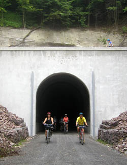 Savage TunnelAt the north end of Big Savage Tunnel The Big Savage Tunnel through Savage Mountain is the critical connecting link in the Great Allegheny Passage. It was opened this year, to the great delight of walkers and bicyclists throughout the region. This is the north portal (on the Pennsylvania side). |