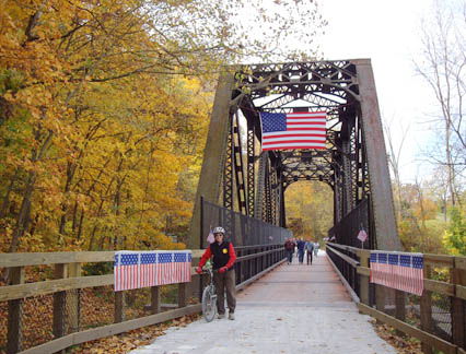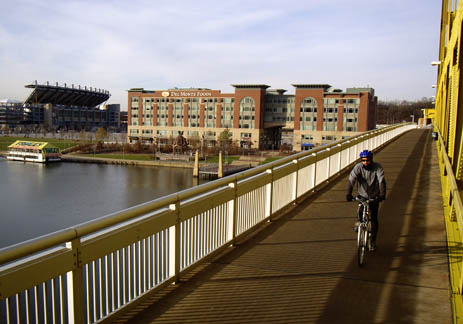Hot Metal BridgeThree Rivers Heritage segment of Great Allegheny Passage, Pittsburgh PA Two near-identical railroad bridges share a single set of piers. The Monongahela Connecting RR bridge on the left once carried general rail traffic and was converted for vehicle use. The Hot Metal Bridge on the right was used to shuttle hot metal from the Pittsburgh Works furnaces to the South Side Works rolling mills; it was converted for bike/ped use. Because of the strategic concentration of rail traffic and steel production, this pair of bridges was the nations’ highest-priority bridge for protection from enemy attack during World War II. |